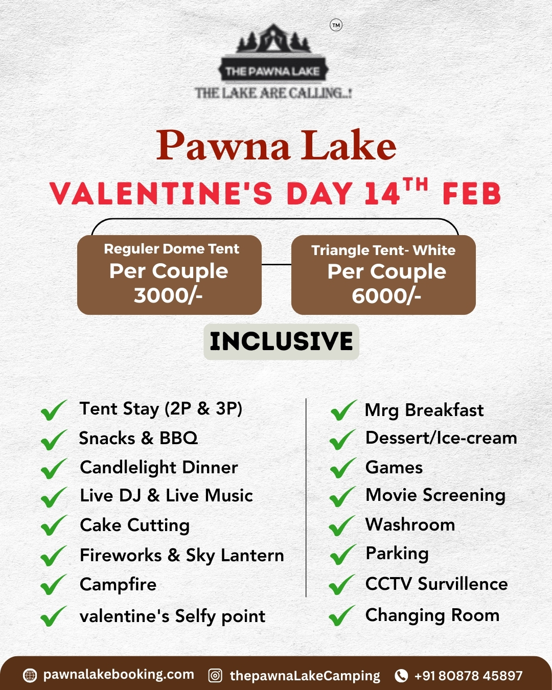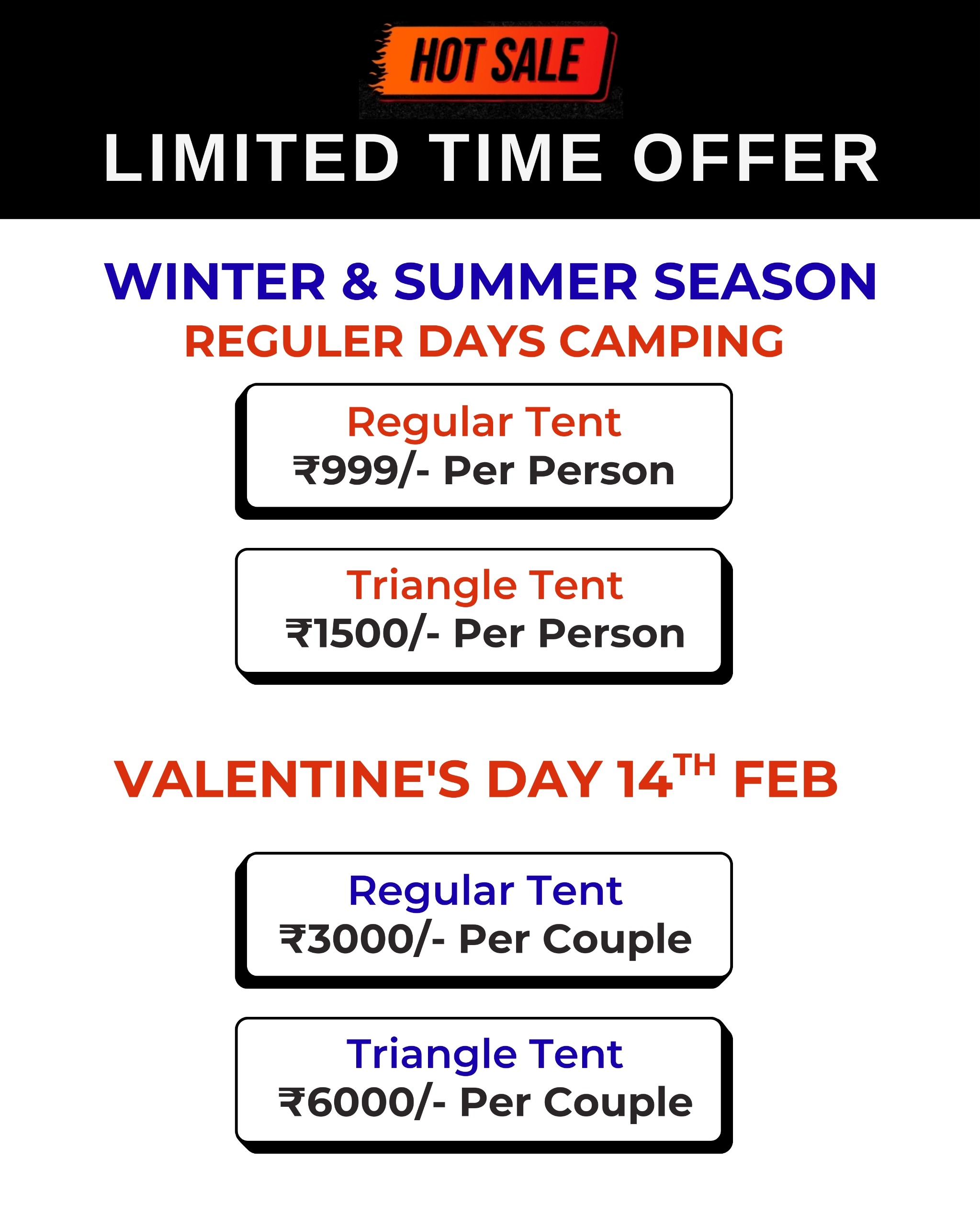 Weekend (SAT – SUN)1500/-pp Weekdays(MON-FRI) – 1000/- pp INCLUDING :- Triangle Tent Stay, Evening Snacks, Tea/Coffee, Barbeque LTD(Veg/Non-Veg), Dinner(Veg/Non-Veg), Morning Breakfast and Tea/Coffee, DJ Music, LIVE MUSIC ( GUITAR), Live Cricket Screen, Campfire, games, Mobile Charging Point, Mineral Water in Jar, First Aid Kit, Parking, Toilets, Changing Room, Genset Light Backup.
