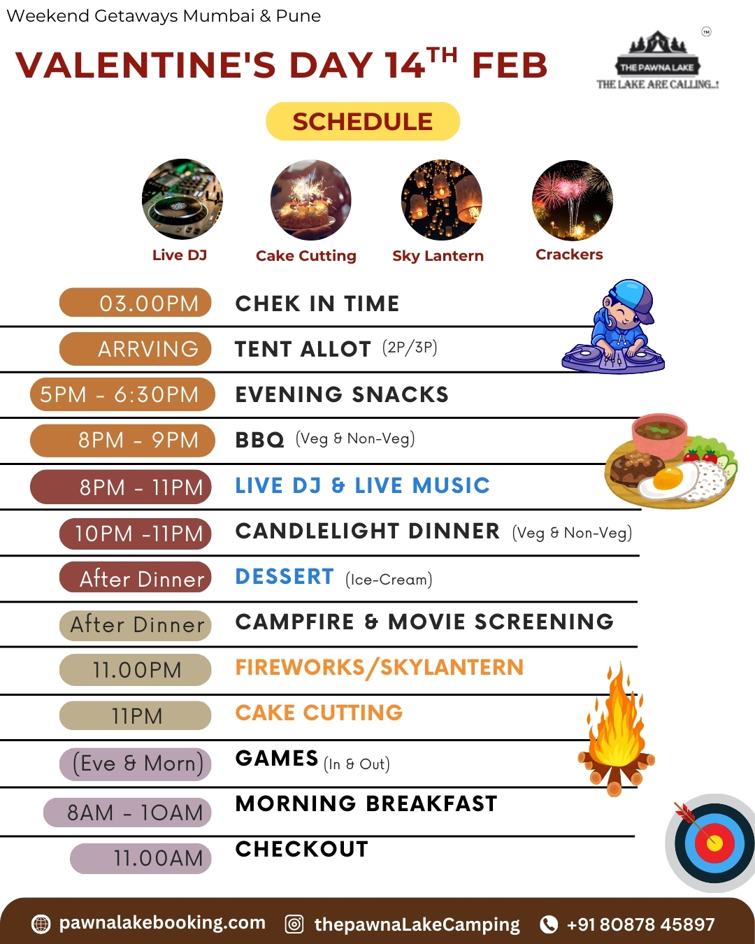 Weekend (SAT – SUN)999/- pp Weekdays(MON-FRI) – 799/- pp INCLUDING :- Waterproof Tent Stay, Evening Snacks, Tea/Coffee, Barbeque LTD(Veg/Non-Veg), Dinner(Veg/Non-Veg), Morning Breakfast and Tea/Coffee, DJ Music, LIVE MUSIC ( GUITAR), Live Cricket Screen, Campfire, games, Mobile Charging Point, Mineral Water in Jar, First Aid Kit, Parking, Toilets, Changing Room, Genset Light Backup.