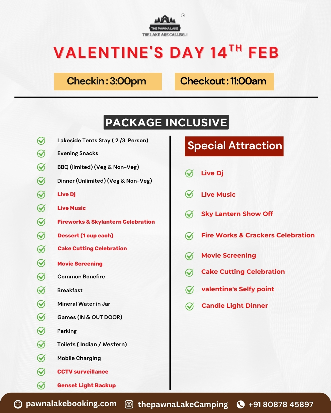Weekend (SAT – SUN)3000/-pp Weekdays(MON-FRI) – 3000/-pp INCLUDING :- Deluxe Room Stay, Evening Snacks, Tea/Coffee, Barbeque LTD(Veg/Non-Veg), Dinner(Veg/Non-Veg), Morning Breakfast and Tea/Coffee, DJ Music, LIVE MUSIC (Saturday), Live Cricket Screen, Campfire, games, Mobile Charging Point, Mineral Water in Jar, First Aid Kit, Parking, Washroom & Bathrrom Attached, Changing Room, CCTV Surveillance, Genset Light Backup.