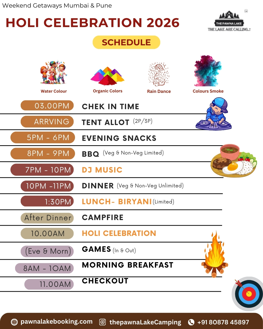 Weekend (SAT – SUN) – 3000/-pp Weekdays(MON-FRI) – 3000/-pp INCLUDING :- Deluxe Room Stay, Evening Snacks, Tea/Coffee, Barbeque LTD(Veg/Non-Veg), Dinner(Veg/Non-Veg), Morning Breakfast and Tea/Coffee, DJ Music, LIVE MUSIC (Saturday), Live Cricket Screen, Campfire, games, Mobile Charging Point, Mineral Water in Jar, First Aid Kit, Parking, Washroom & Bathrrom Attached, Changing Room, CCTV Surveillance, Genset Light Backup.