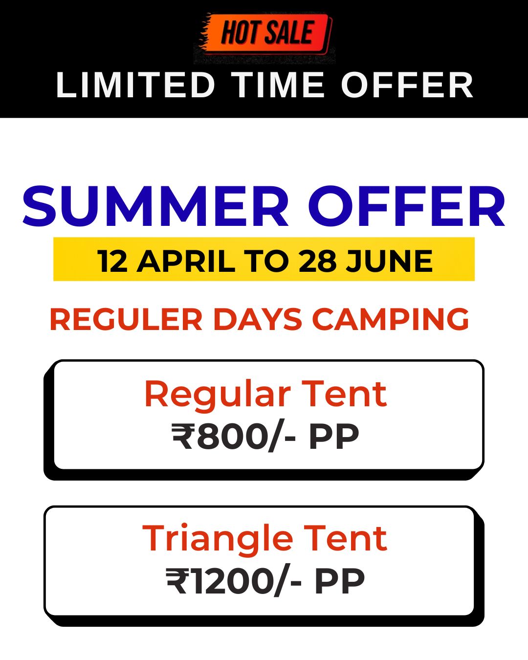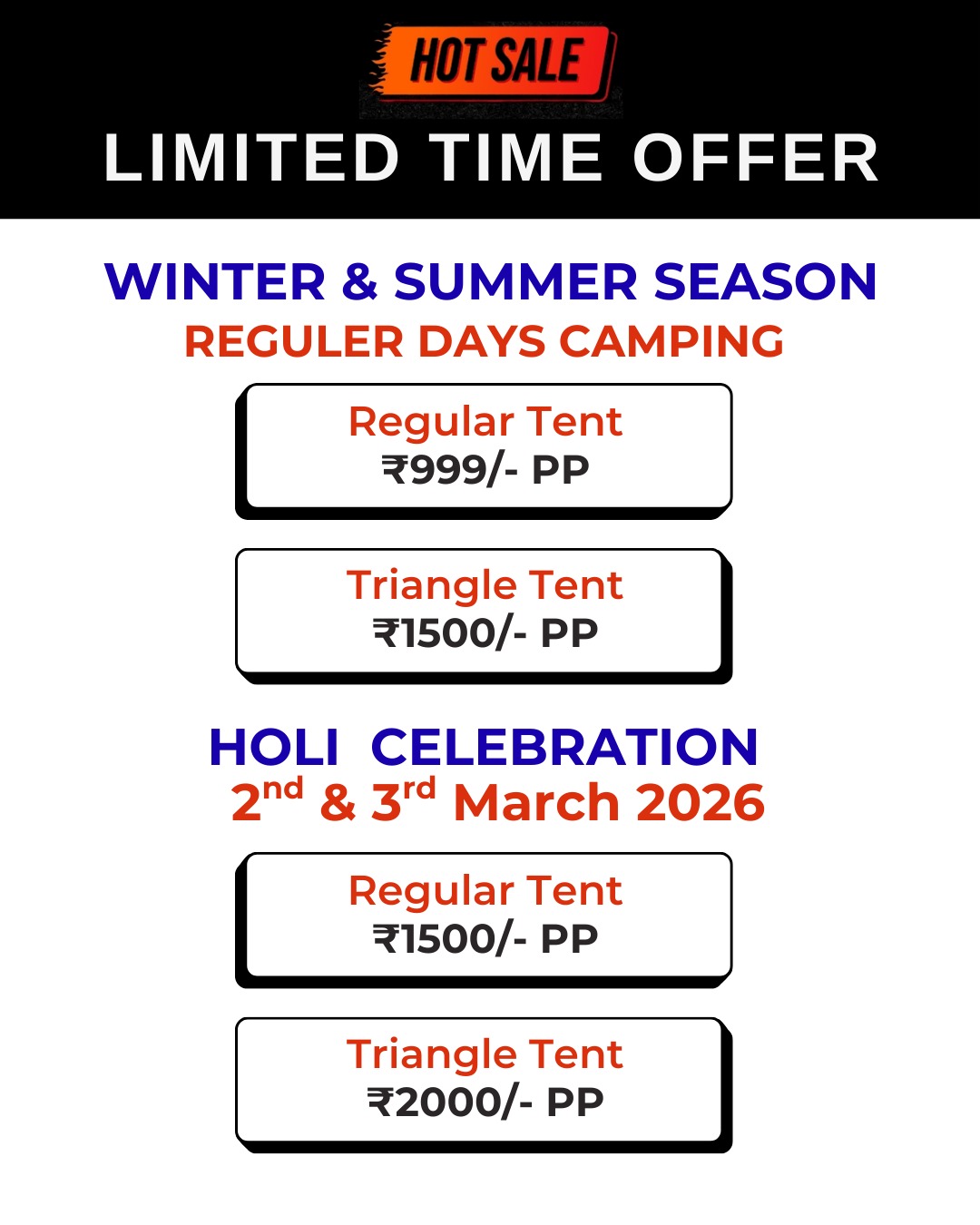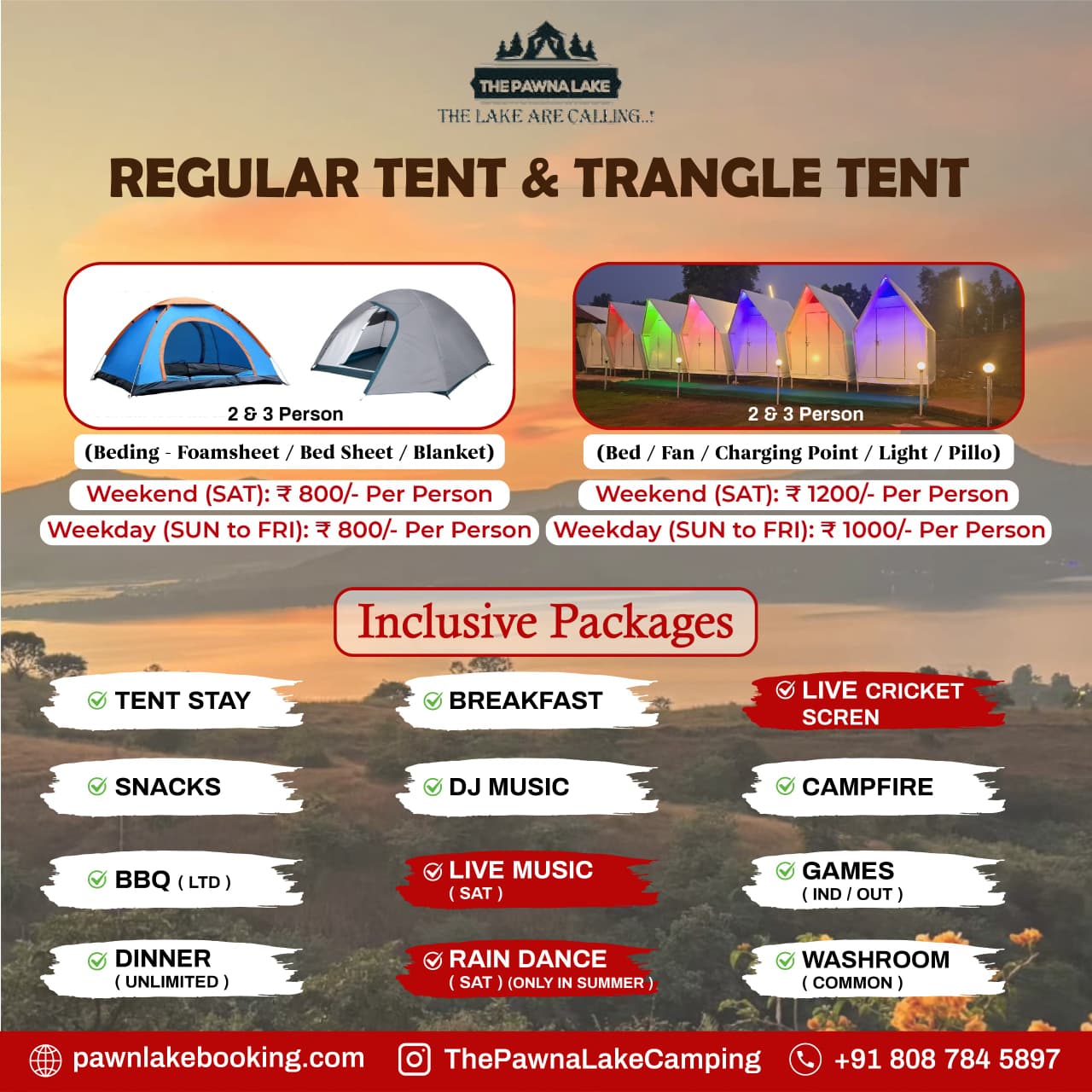 Weekend (SAT – SUN) – 1500/-pp Weekdays(MON-FRI) – 1000/- pp INCLUDING :- Triangle Tent Stay, Evening Snacks, Tea/Coffee, Barbeque LTD(Veg/Non-Veg), Dinner(Veg/Non-Veg), Morning Breakfast and Tea/Coffee, DJ Music, LIVE MUSIC ( GUITAR), Live Cricket Screen, Campfire, games, Mobile Charging Point, Mineral Water in Jar, First Aid Kit, Parking, Toilets, Changing Room, Genset Light Backup.