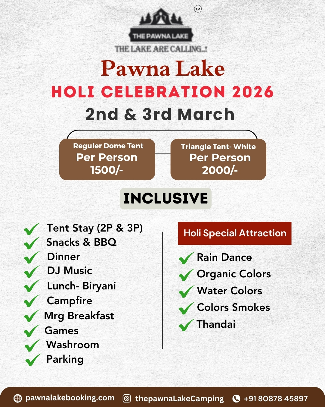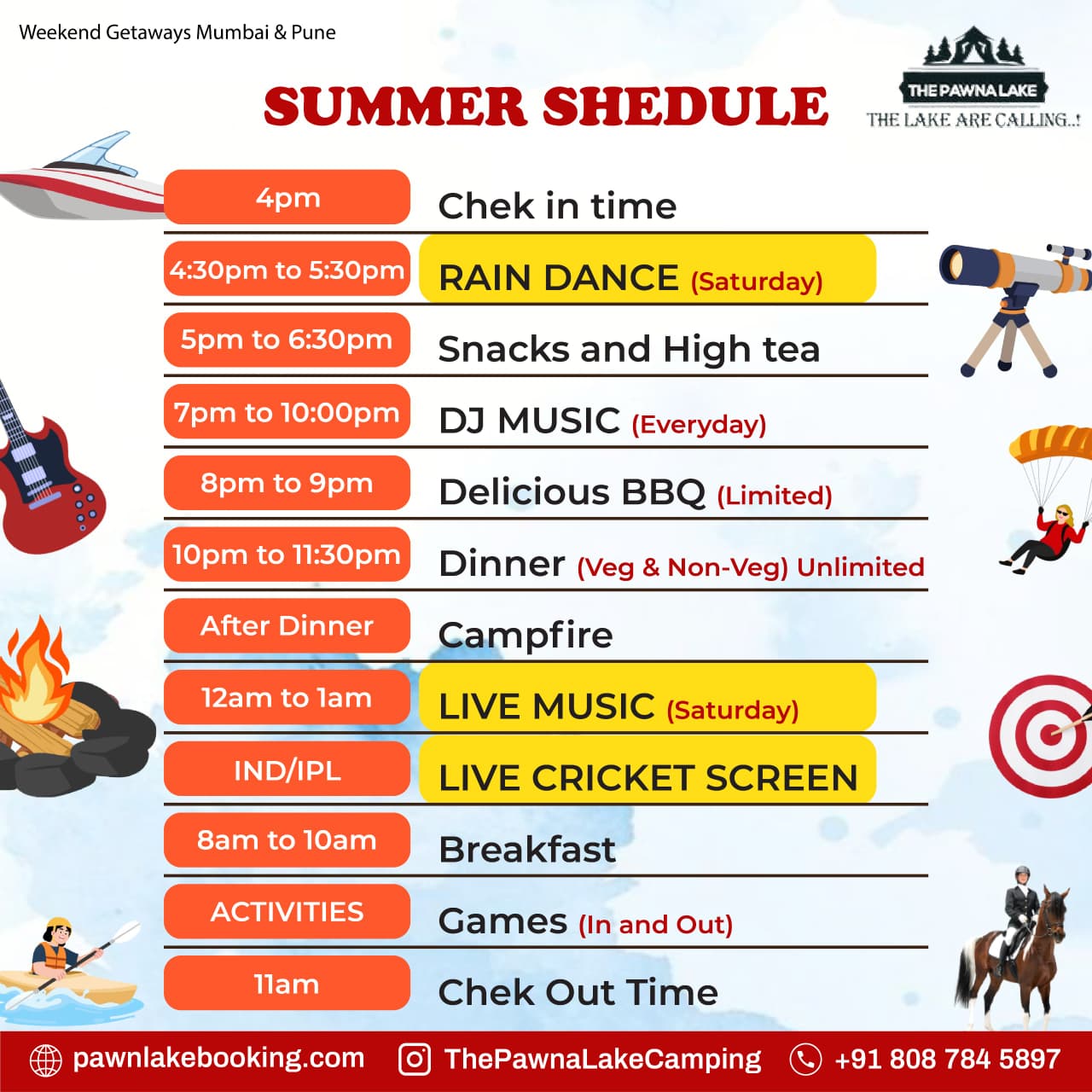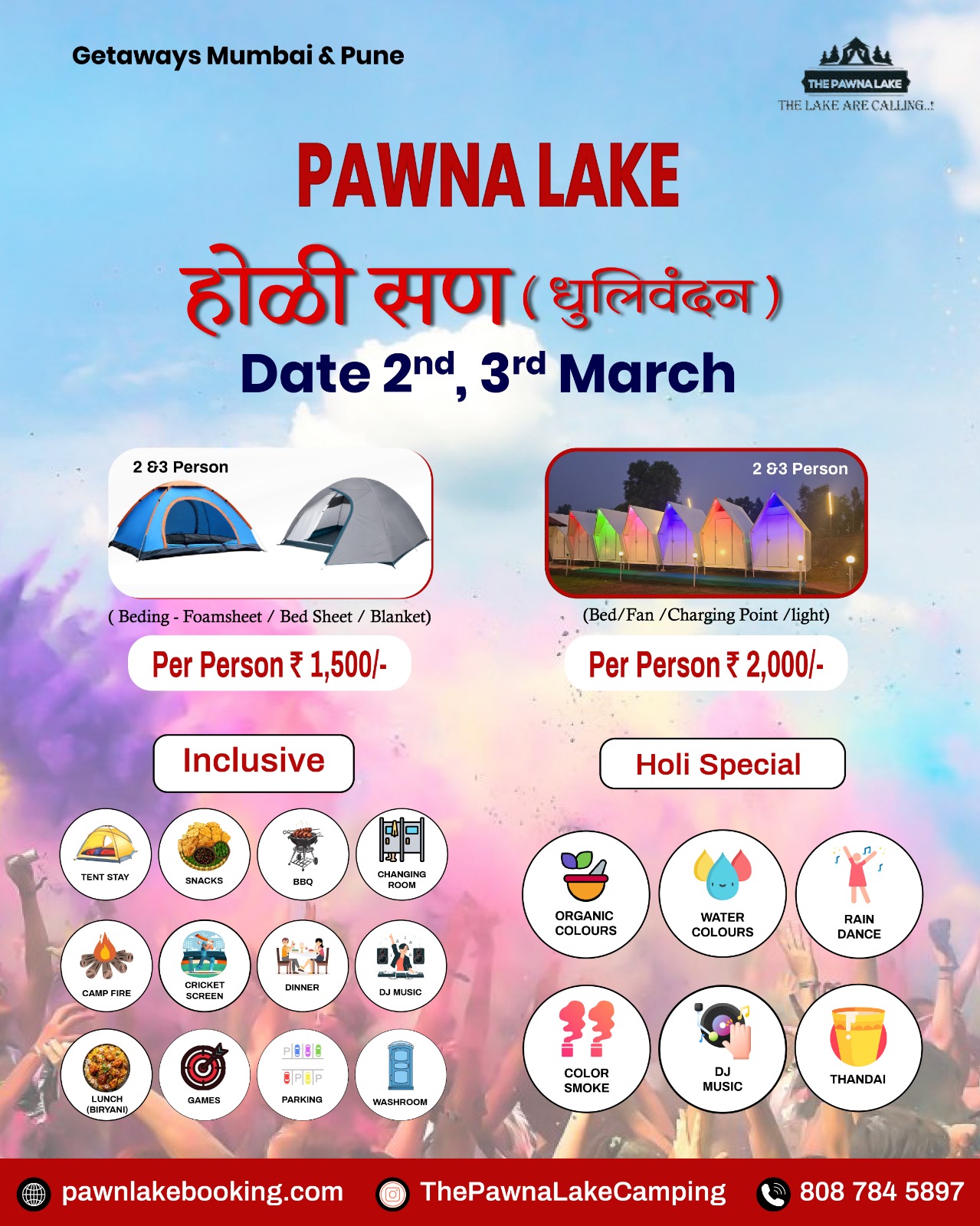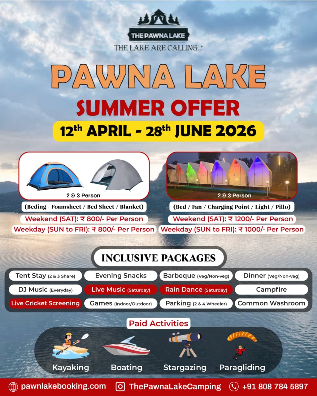 Weekend (SAT – SUN) – 3000/-pp Weekdays(MON-FRI) – 3000/-pp INCLUDING :- Glamping Stay, Evening Snacks, Tea/Coffee, Barbeque LTD(Veg/Non-Veg), Dinner(Veg/Non-Veg), Morning Breakfast and Tea/Coffee, DJ Music, LIVE MUSIC (Saturday), Live Cricket Screen, Campfire, games, Mobile Charging Point, Mineral Water in Jar, First Aid Kit, Parking, Washroom & Bathrrom Attached, Changing Room, CCTV Surveillance, Genset Light Backup.