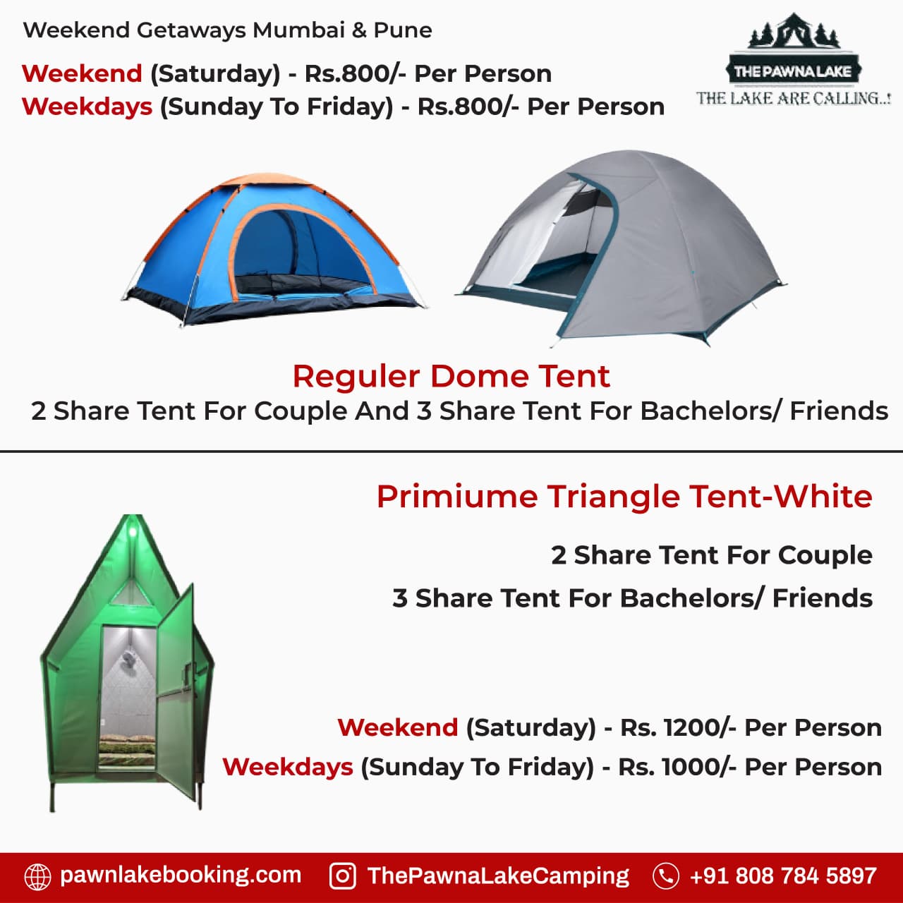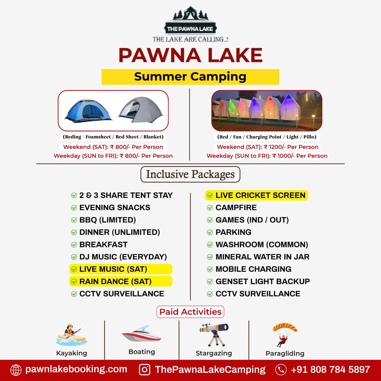 Weekend (SAT – SUN) – 999/- pp Weekdays(MON-FRI) – 799/- pp INCLUDING :- Waterproof Tent Stay, Evening Snacks, Tea/Coffee, Barbeque LTD(Veg/Non-Veg), Dinner(Veg/Non-Veg), Morning Breakfast and Tea/Coffee, DJ Music, LIVE MUSIC ( GUITAR), Live Cricket Screen, Campfire, games, Mobile Charging Point, Mineral Water in Jar, First Aid Kit, Parking, Toilets, Changing Room, Genset Light Backup.